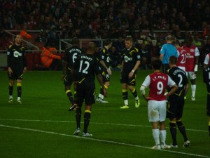 It was then Arsenals turn to sting the hands of our very own ‘Cheesey Wotsit’ – Adam Bogdan. (He is ginger and wears a bright orange kit). Thomas Vermaelens’ thunderous free kick was going in until Bogdan got a strong hand to it and pushed it out for a corner.