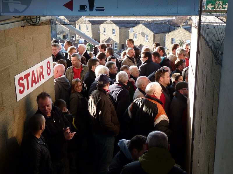 We then fought our way across the concourse, which like the steps was of an unusual design. It was open to the elements, think of it as a hotel balcony… but without the beach. After finally reaching the correct entrance we were greeted by a steward – who to put it quite frankly, couldn’t organise a p*ss up in a brewery. He took the ticket out of my hand; stared at it blankly for around 30 seconds. He didn’t really know where our seats were, so he just pointed rather generically at an area of seating, and sent us on our way.