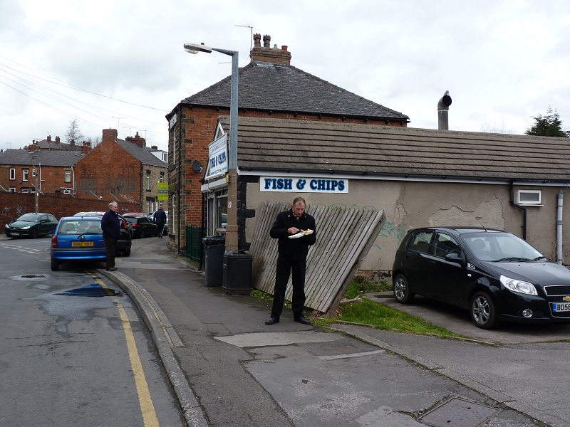 Tickets bought, and we were starving… TIME TO SEARCH FOR A CHIPPY! However, there was one slight problem, nobody could direct us to one. I resorted to asking Twitter for help, and I had around 20 replies informing me of chippies in the vicinity of Oakwell. Eventually we stumbled upon an aptly named outlet called “FISH & CHIPS”.