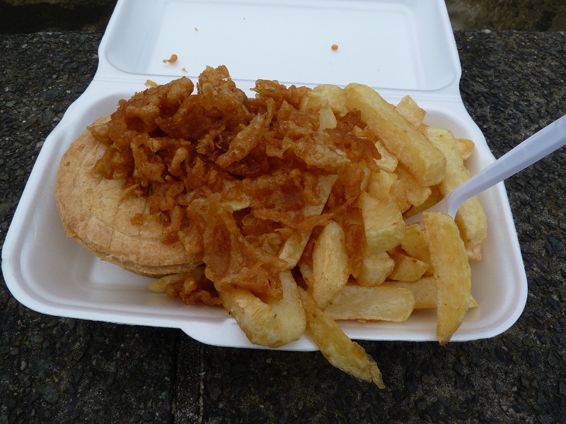 Zack ordered a Sausage and Chips, with scraps. I ordered a Steak Pie and Chips, with scraps. I am never eating scraps again! They were horrible! I only asked for scraps because everybody else in the queue seemed to have a fetish for the apparent delicacy.