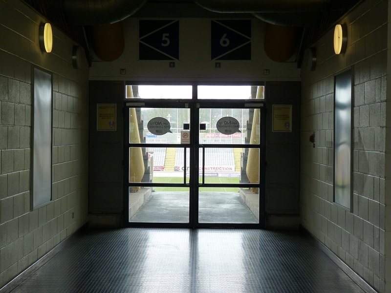 Eventually I picked my ticket up, and entered through the turnstiles. It was a strange setup at Rotherham. First of all you go through your normal turnstiles, then you walk through a car park, then you walk over a bridge, through some glass doors and finally on to your concourse. It seemed like the architects who designed The Don Valley Stadium wanted to give it the Disneyland feel. I was half expecting Donald Duck to pop up from behind the refreshments area!