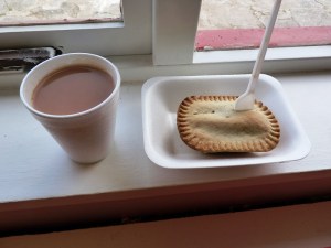 Time passed very slowly, and I think Carly was relieved when the 15 minutes were up as she couldn’t deal with me complaining any longer. I purchased a Hollands Steak Pie, and a cup of tea… which basically tasted of the polythene cup, but it did warm me up.