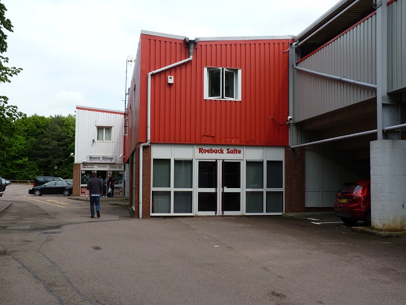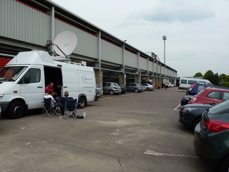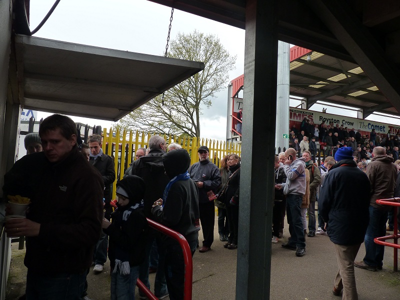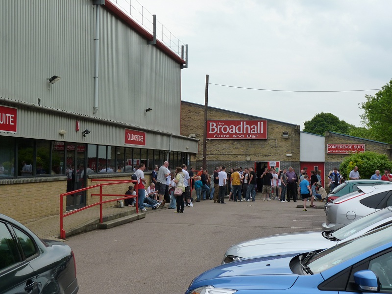 After the Tom Tom opted for a somewhat scenic route, opposed to the beautiful drive through Luton – we arrived at Broadhall Way around 12:35. We took full advantage of the free parking; which can be found over the dual carriageway, next to the ground. The free parking is on a field basically, but it is surprisingly easy to get out of at the end.