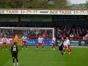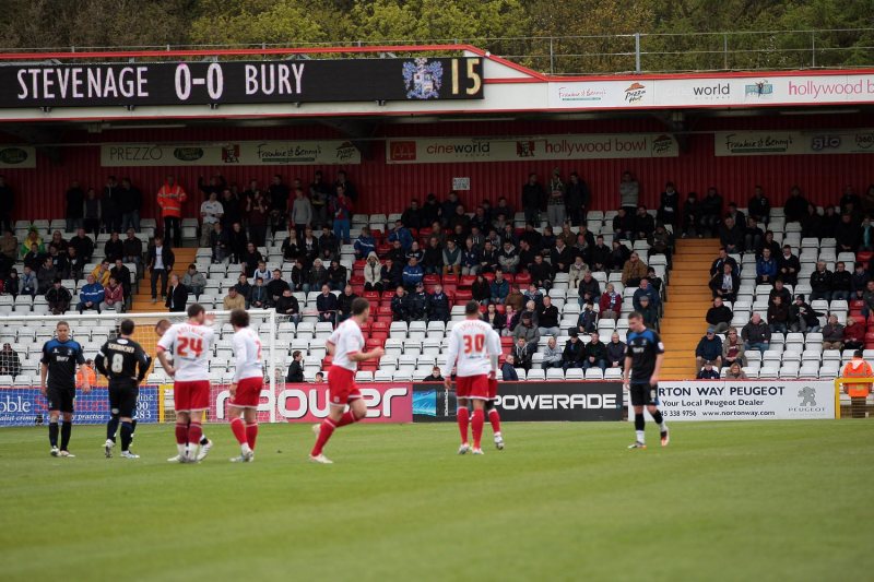 The scoring was opened on 23 minutes when Luke Freeman worked the ball well down the line. His cross took a deflection off Efe Sodje, and threw the Bury defence. As the ball came back down, Stevenage striker Craig Reid was on hand to control well with his chest, before volleying into the back of the net. The Lamex went wild… and for the first time we heard a home fan!