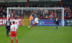 76 minutes, and the match was settled. Stevenages Robin Shroot darted into the area after being fed through brilliantly. Shroot cut inside Andrai Jones and Efe Sodje, before he blatantly chucked himself. There was no contact whatsoever, which is exactly what the referee thought when he told Shroot to get up. However, the linesman viewed the incident differently and flagged for a penalty.