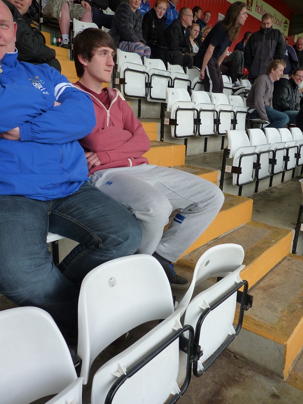 We sat in the South Stand, behind the net. Incredibly, it was only built in 2001 and already looks past its best. It is claimed the stand can hold 1,400, but in all fairness it struggles housing 400. The toilets are insufficient. The space at the back of the stand is non existant. The food van isn’t big enough, resulting in vast queues. To walk to your seat you have to clamber you way across an aisle at the front of the stand. This often gets blocked. Oh, and the seats snap easily, as we all found out – More on that later on.