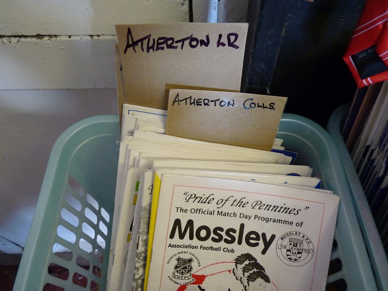 Having browsed through my Gibbo’s92 award winning non-league programme, I then walked down a flight of stairs, and entered the ground. I found Ben, James and Chappers who were having a wild spending spree down in the supporters club shop. Ben got slightly exited when he found an Ossett programme on sale for 50p. He also purchased a Mossley scarf for £3. He was definitely in the mood for spending his money. Bless him. I may take the mick out of him, but I was just as excited when I looked into the corner of the room and saw a box FULL of Atherton Collieries and Atherton Laburnum Rovers programmes!