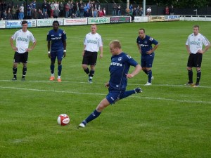 It was the visitors who took the lead on 14 minutes when Gary Gee fouled James Tarkowski in the area. My opinion was that Tarkowski threw himself, but Joe and Aaron argued it was indeed a penalty. As Robbie Simpson was placing the ball on the spot, we told Mossley keeper Martin Pearson to dive to his right. He smiled at us, and mouthed something. Simpson stepped up, and placed the ball into the exact corner we told Pearson to dive to. Pearson did follow our instructions, but unfortunately for him, he was just unable to get a finger to the ball.