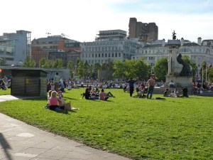 After catching the 12:45 train from Atherton to Manchester Victoria, we then caught the Metrolink up to Piccadilly Gardens. Piccadilly was its usual busy self on a sunny day, and I could have happily stayed in the Gardens sunbathing… but we had a football match to get to! Having only a few minutes before the 201 bus arrived, we were soon on our way to Gorton.