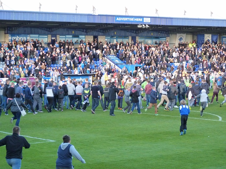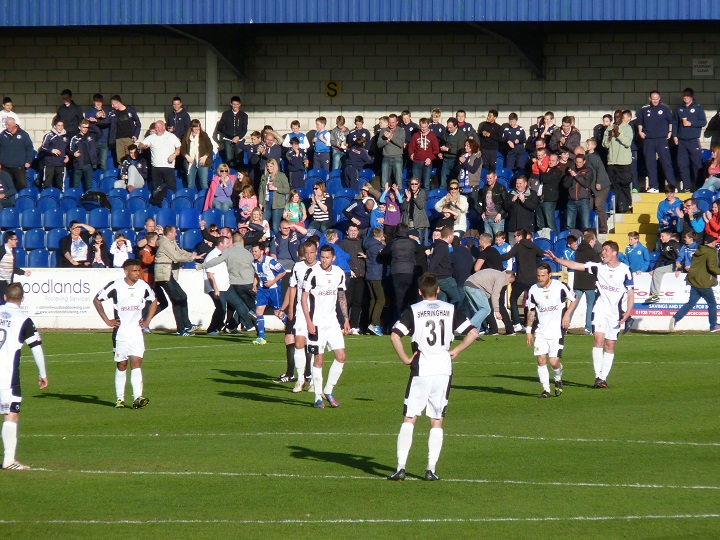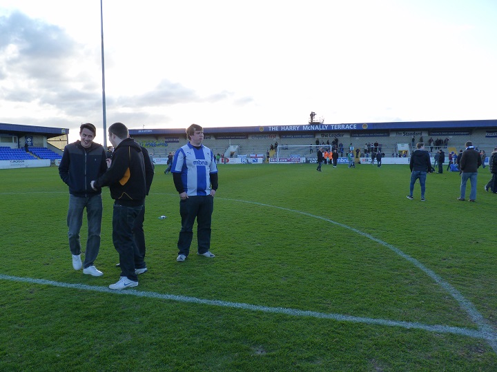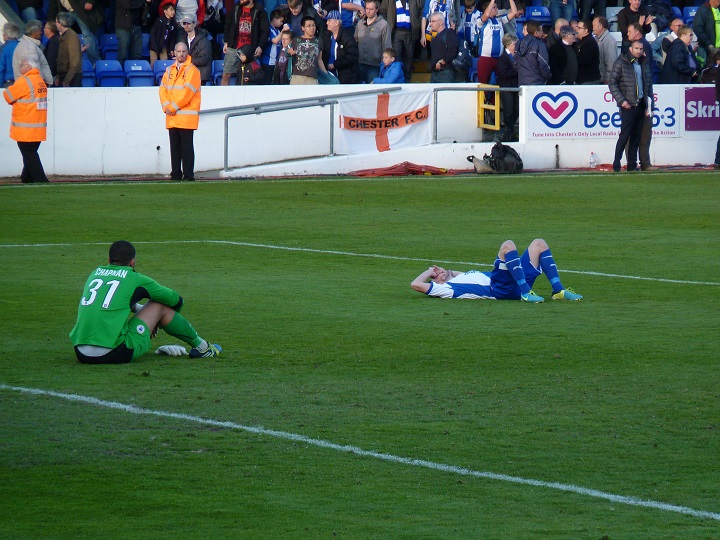 The atmosphere was an odd one. One minute it was quiet, then the next somebody cheered which then made the whole ground wonder if luck was on their side. It wasn’t to be. The final whistle went, and we in the crowd knew that Chester had been relegated. The players didn’t know this however, and it was left to the tannoy announcer to break the news.