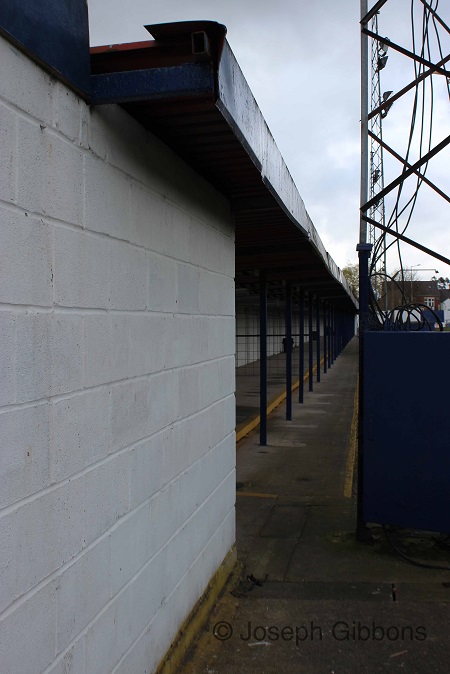 The Main Stand at Winsford is home to club offices and a social club which is hidden from view. When eventually found, the social offered a brief respite from the cold, wet weather which had descended on the Cheshire town. However, that’s about all it offered. It was a bleak and dismal setting which was barely lit and is in desperate need of an overhaul. One plus was that there were many home fans congregated in the room, meaning that we could all huddle together like emperor penguins to keep warm.