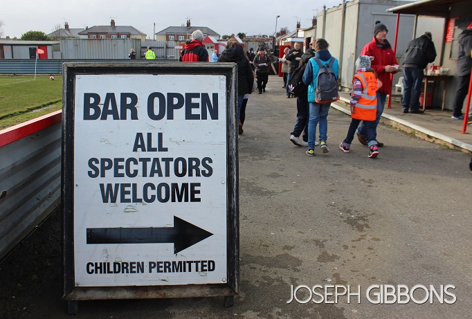 Most of the home fans were keeping warm and having a drink in the Seasiders Bar. It was quite a large clubhouse, but there were that many supporters in there it was hard to find somewhere to sit. We ended up crashing in the corner of the room next to a make shift club shop, amongst a collection of dart boards. If the club would have put some music on it may have felt a bit like a really rubbish nightclub. People were walking around with stamps on their hands, including ourselves, and I felt like I was on a night out in Leigh… although that may be quite insulting towards Bridlington.