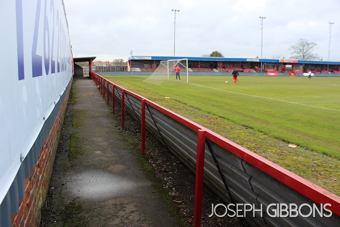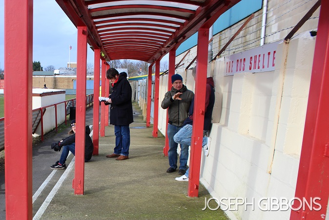 A large main stand stretches the length of the pitch, consisting of seating and standing. The top corner of this stand which has the terracing was extremely blustery on this visit as it protruded above the wall at the far end which sheltered most of the ground. Opposite the main stand is the Bus Shelter which offers covered standing room for a handful of fans. There is also a shed to the side of the goal at the far end of the ground.