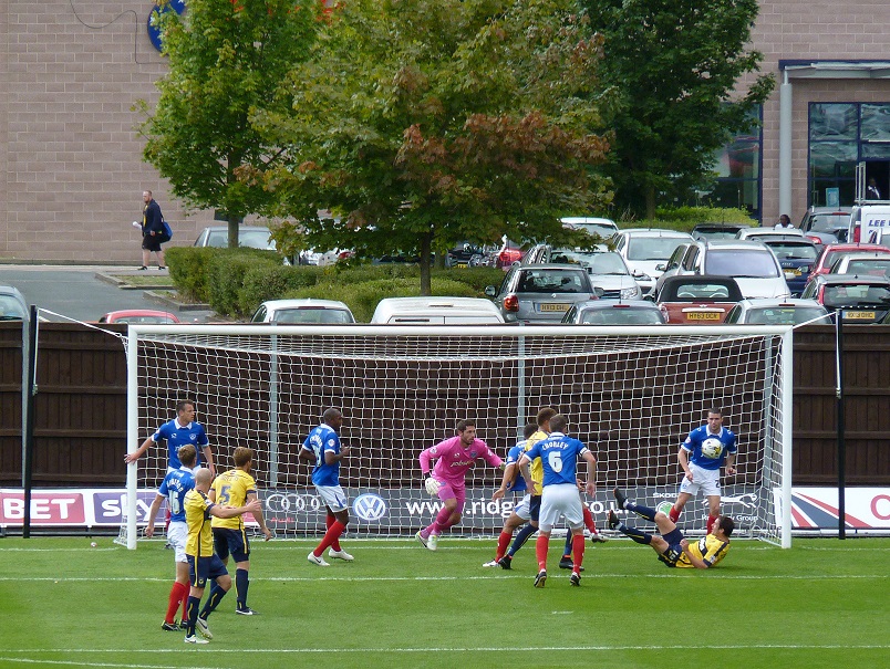 P1390561The half ended with Oxford on top and they came close to opening the scoring once again from a corner kick. The ball was floated into Danny Hylton who saw his shot cleared off the line. It came back to Hylton who then smashed the ball against the left hand post. For a third time it fell to Hylton who this time saw his shot deflect over the bar and against the wooden fencing.