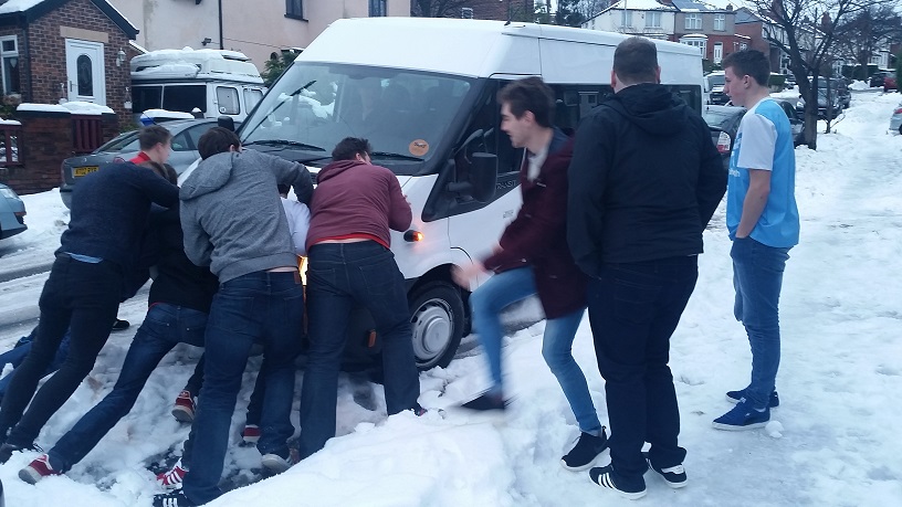 It hadn’t snowed that much in Sheffield city centre, but towards the outskirts it was ridiculous. The minibus headed down an estate which was full of hills and all was going well until a car made the bus move to the side. When we went to set off the tyres were spinning everywhere. Ten minutes of pushing and spinning and we were finally back on our way down south, with the next stop being Peterborough services.