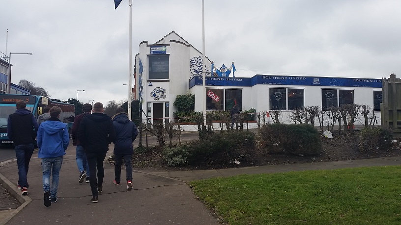 More jagerbombs and beers were opened as we continued down south, stopping for a quick break in Bishop’s Stortford before arriving in Southend-on-Sea just before 13:00. Southend, of course, is a famous seaside resort in Essex, meaning that this is probably the furthest east I have travelled in the country to watch football. Unlike my trip to Colwyn Bay last month, I didn’t get to explore much of the seaside town meaning I didn’t get to see the world’s longest leisure pier which is over a mile long.