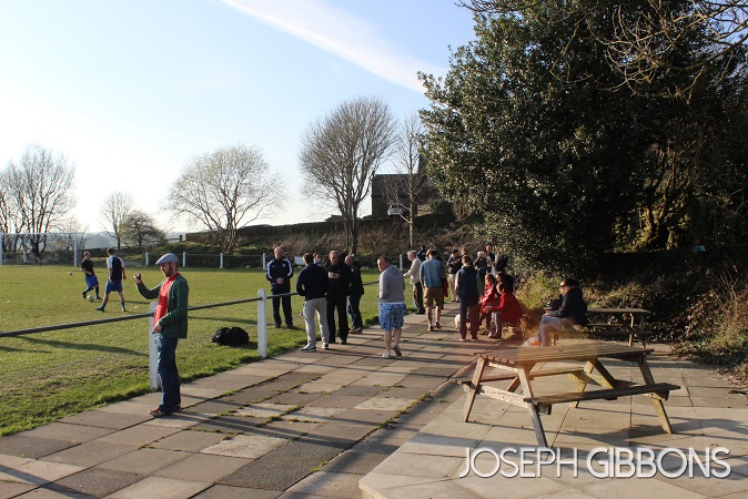 The area has three large reservoirs which supply the Bolton area; Jumbles, Turton and Entwistle & Wayoh. The latter backs on to Turton’s ground which we found quite difficult to find. Down a small residential estate we came across an area which had yellow cones across a number of drives – usually a tell tale sign there is a football match close by. Various work vans suggested that players had arrived straight from work. Groups of families squeezing down ginnels at the bottom of cul-de-sacs pointed us in the right direction.
