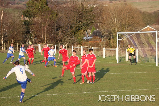 The worst challenge of the match arrived on 34 minutes when a Turton player was scythed down from behind. We watched this from the top of the hill overlooking the reservoir but the screeches could have been heard on the other side of the water. No yellow card was given, somehow, but I don’t really mind that… as long as the referee is consistently lenient. The resulting free kick was hammered into the wall before the ball was headed over by former Heys player Damion Keegan.