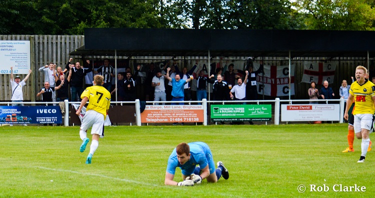 However, despite the early pressure Brighouse took the lead on 22 minutes. From a corner, the ball was curled into the packed box. Brig’s Daniel Facey saw his initial header was well saved by Danny Taberner but Leon Henry was the quickest to react and fired the rebound in from six yards out.