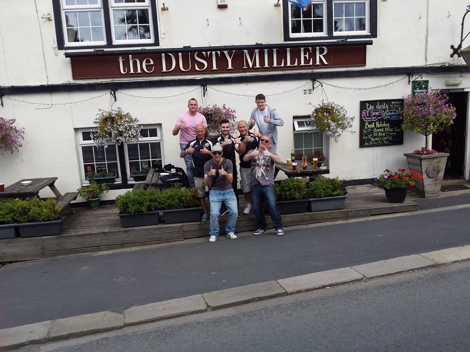 Lee, Matt, Zak and I piled into the final taxi to arrive. Our taxi driver had his oriental music on full blast and he seemed to enjoy the fact we were dancing along. We couldn’t hear each other speak it was that loud. We turned up at the Dusty Miller to find the rest of the group outside drinking, feeling pretty startled by the sound of our appearance. We had a pint of Tiger before then moving on up through the estate behind the pub and to the ground.
