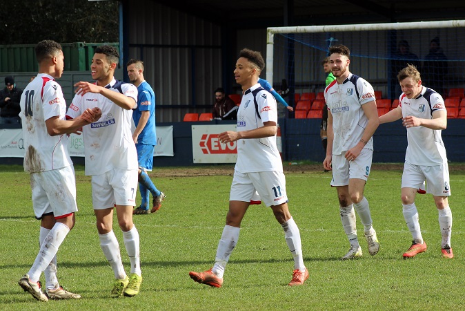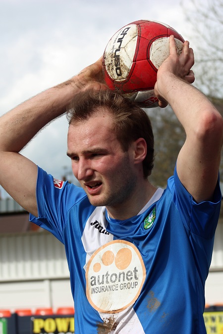 With the home side in their traditional blue they attacked the far end in the first half. Joe Woolley was involved in their best move of the first half on five minutes when he won the ball and fired it just wide of Ash Rawlins post. The young winger then turned provider when his weaving run led to a deft cross which striker Nick Wellecomme couldn’t turn towards goal.