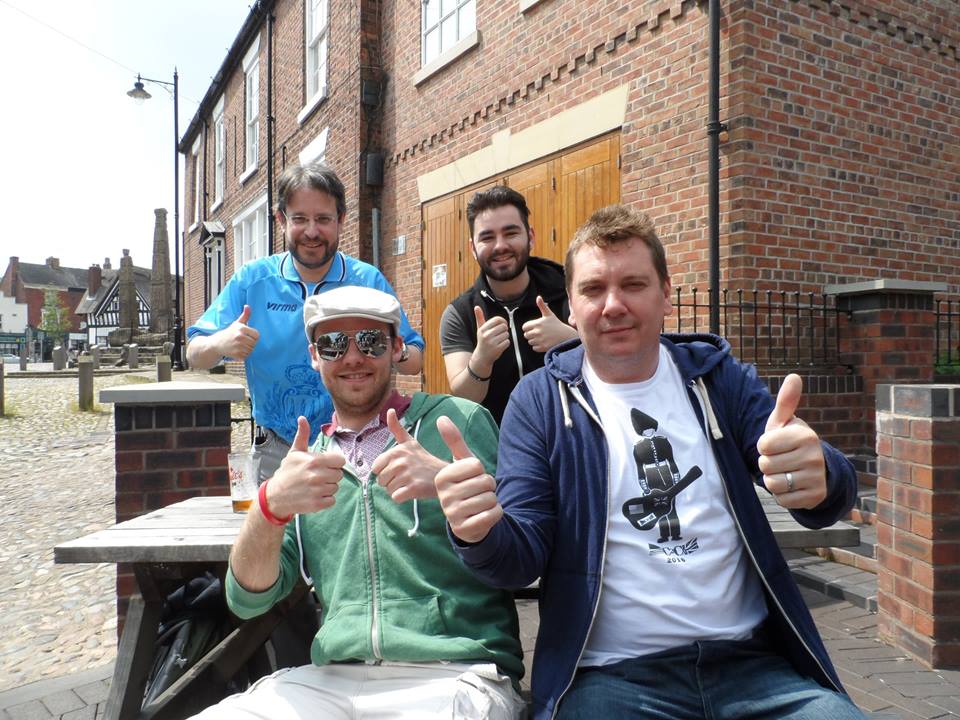 Next up was the Lower Chequer, tucked away from The Cobbles, just behind the Crosses. There were other people who were seemingly doing a pub crawl of the town a bit like us, mainly couples who obviously couldn’t be bothered heading to Manchester for the afternoon. Unfortunately, one of the couples consisted of two male dog walkers who went on to lecture us about the advantages of having a double dog lead, not for one second did we doubt their opinions on such an invention. As the bells from the nearby Church provided a constant a backdrop of music, we sat drinking pints of Shropshire Blonde and Green Monkey, trying to avoid eye contact with our dog walking friends. The beer was going down well, perhaps because it is brewed in Market Drayton, a town we had formed a bit of a connection with this season having seen them play away from home three times. We opted to stay in the Lower Chequer for a while before Prescot Cables fan David spotted us from across The Cobbles and joined us for the rest of the day; three were now four!
