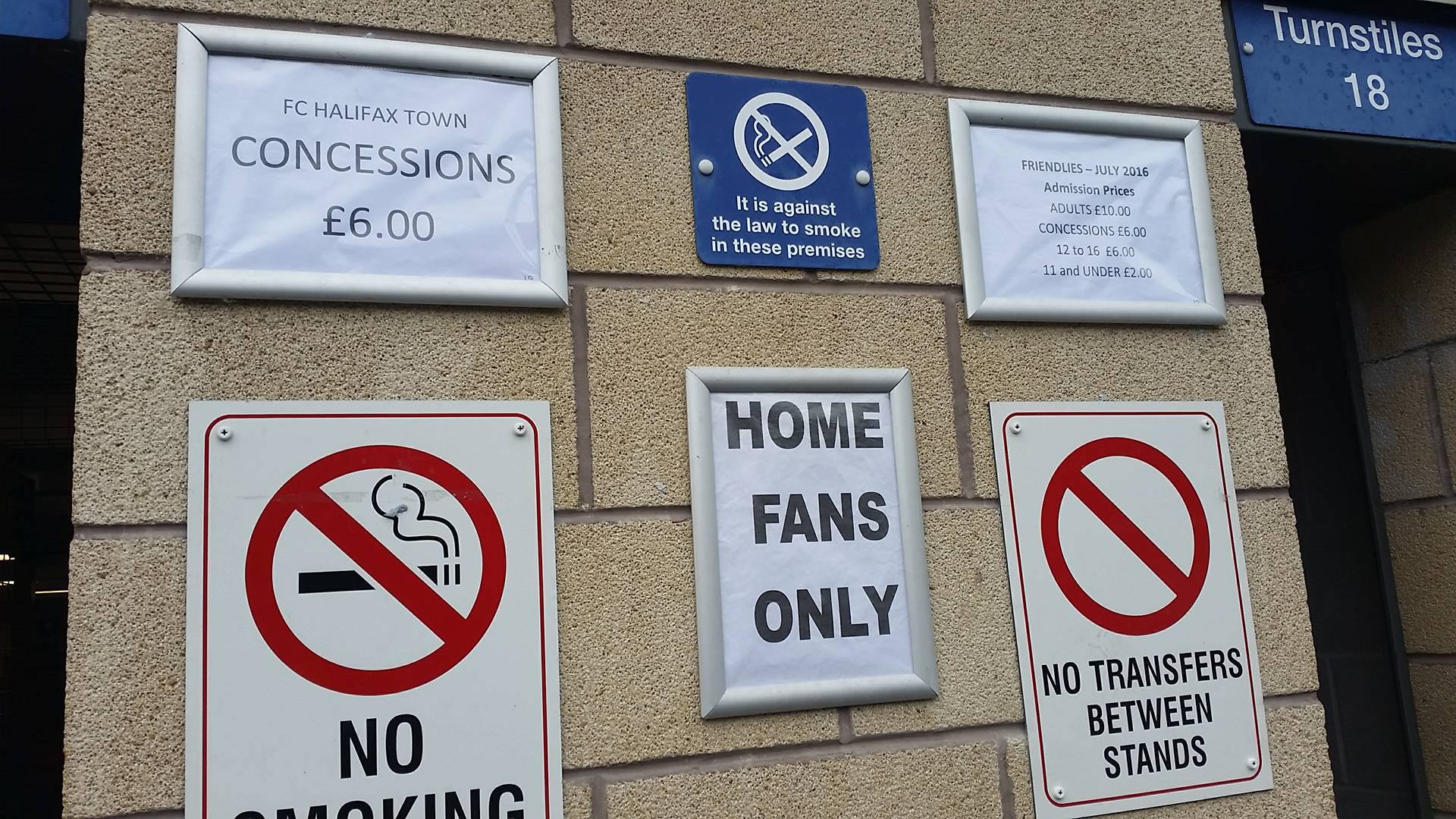 This match was only a friendly against League Two outfit Accrington Stanley. Really, as a Lancastrian I should have been in the away end but we fancied a nice chilled out afternoon in the home end. It was very quiet in the supporters bar before the match, where just a handful of Halifax fans were supping on pints of locally brewed pale ale. It would have been rude not to join them, so with a pint of Withens in my hand we sat down in the corner beneath the television. We were mithered to participate in the half time draw before we made our way to the only turnstiles that were in operation for the home end.