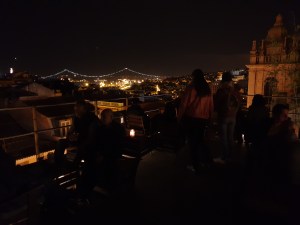 It had different levels in this bar. A DJ was playing a set to himself near the door, while a group of women sat in a booth in the corner drinking wine. The long bar had some annoying Americans downing beer, all trying to be louder than the other; like they tend to do on their breaks in Europe. Past the bar, we came to the very top of the car park. It was an open terrace that overlooked the city and it was brilliant. In the near distance was the Ponte 25 de Abril which is the iconic bridge which stretches over the Tagus River.