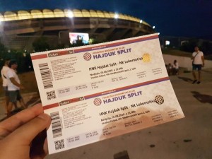 A large queue for tickets snaked around the approach to the stadium, which was somewhat annoying. There were six ticket booths, each emblazoned with a letter which spelt out Hajduk if viewed from the correct angle. Only one booth was open though, meaning we had to wait well over half an hour to get hold of ours. Did they want people to watch the game or not?
