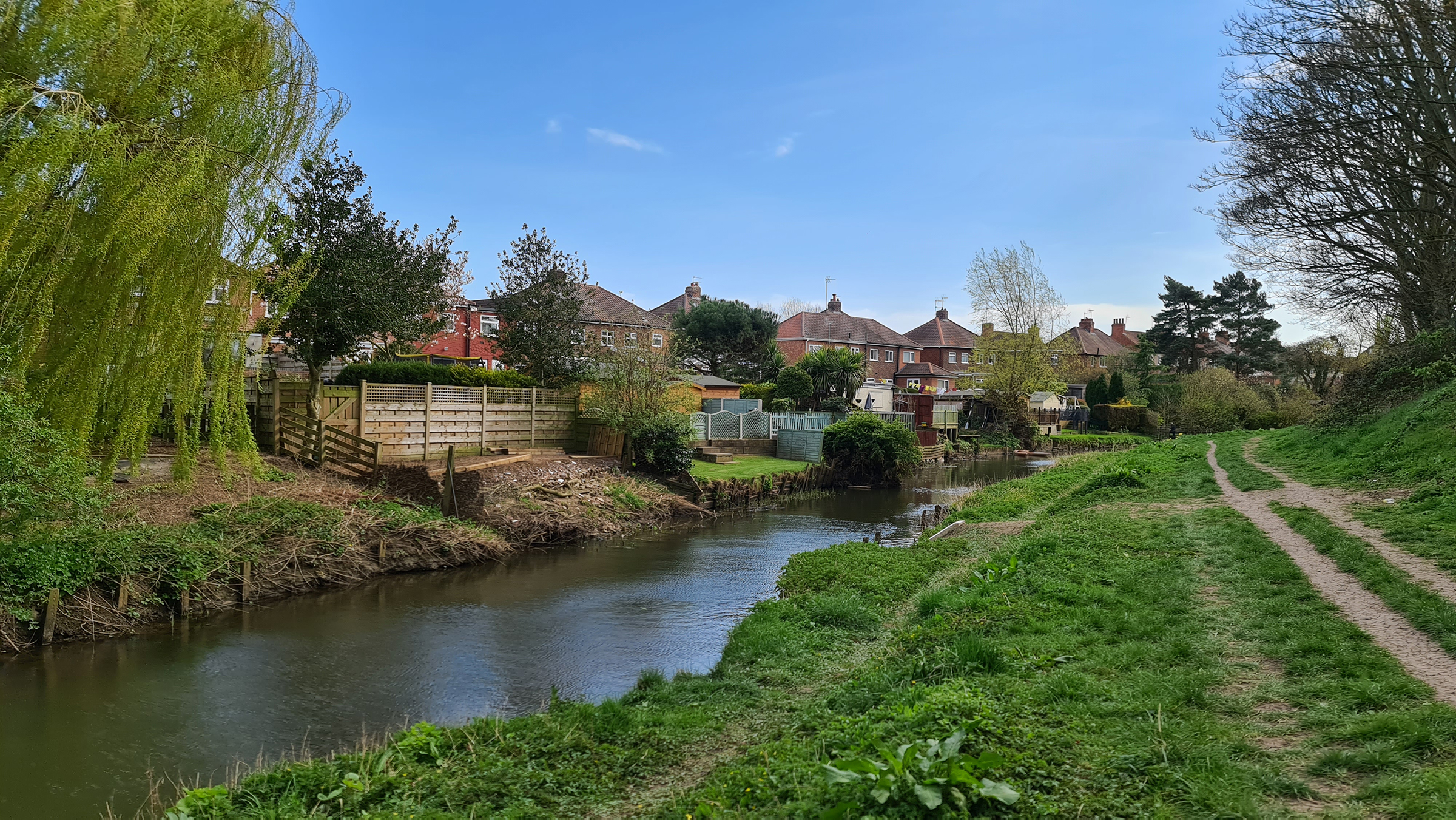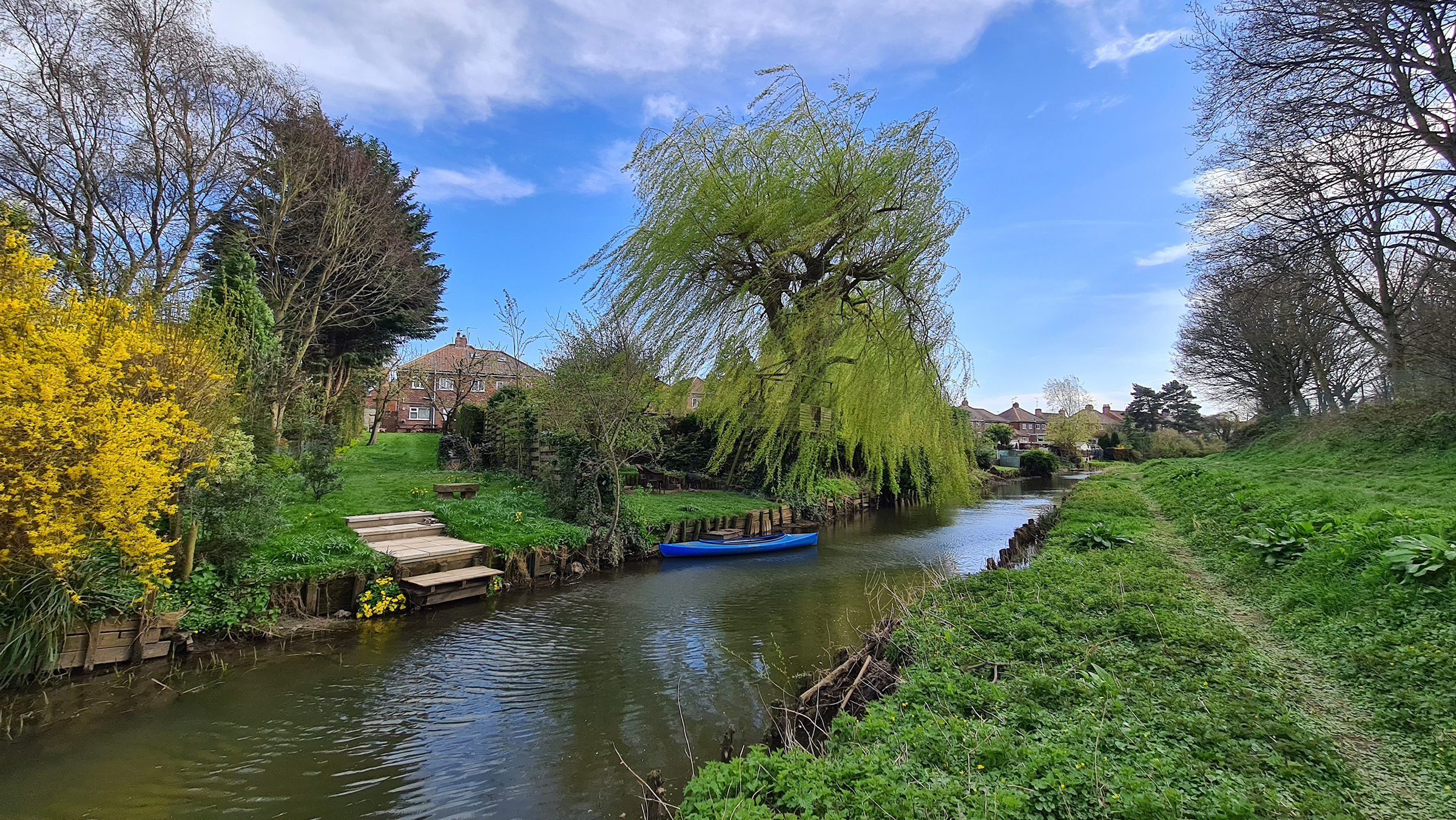 Back in later 2015, if we had tried to walk down this stretch of the river we would have been submerged. Quite dramatically, the area flooded following the failure of the flood barrier further downstream where the Foss meets the River Ouse. Water gushed back up the Foss, flooding hundreds of properties and businesses. Despite the risks associated with living here, as the sun shone down on back gardens where the river lapped upon the grass verge, you would snap up one of these houses in a heartbeat.