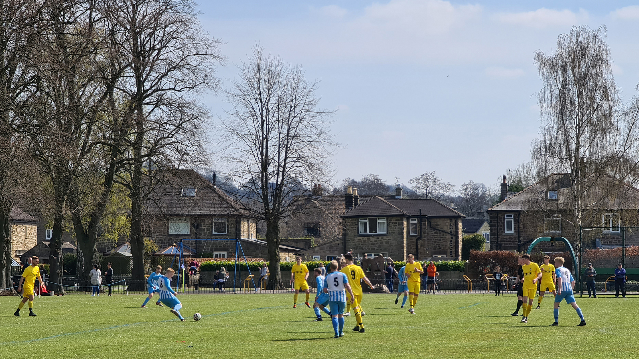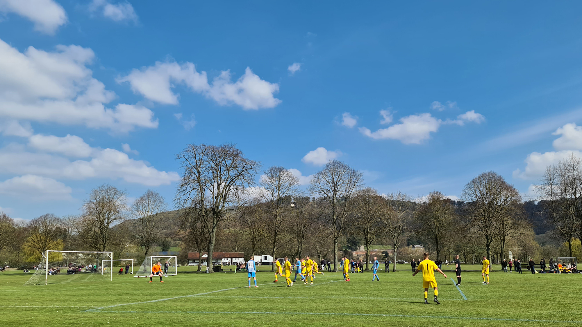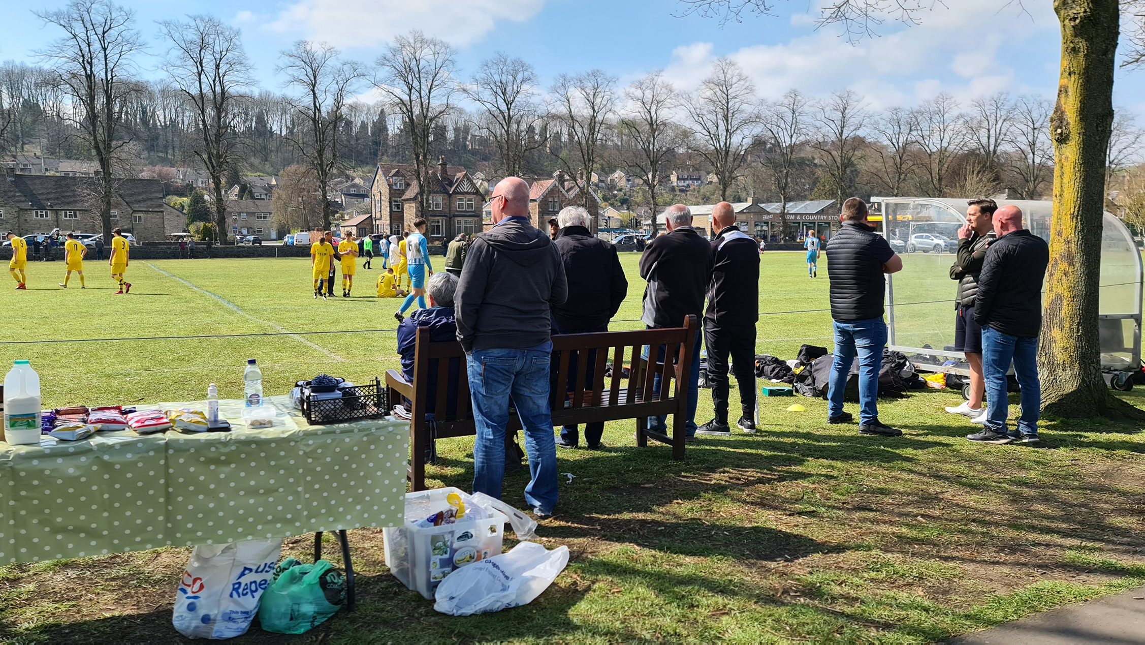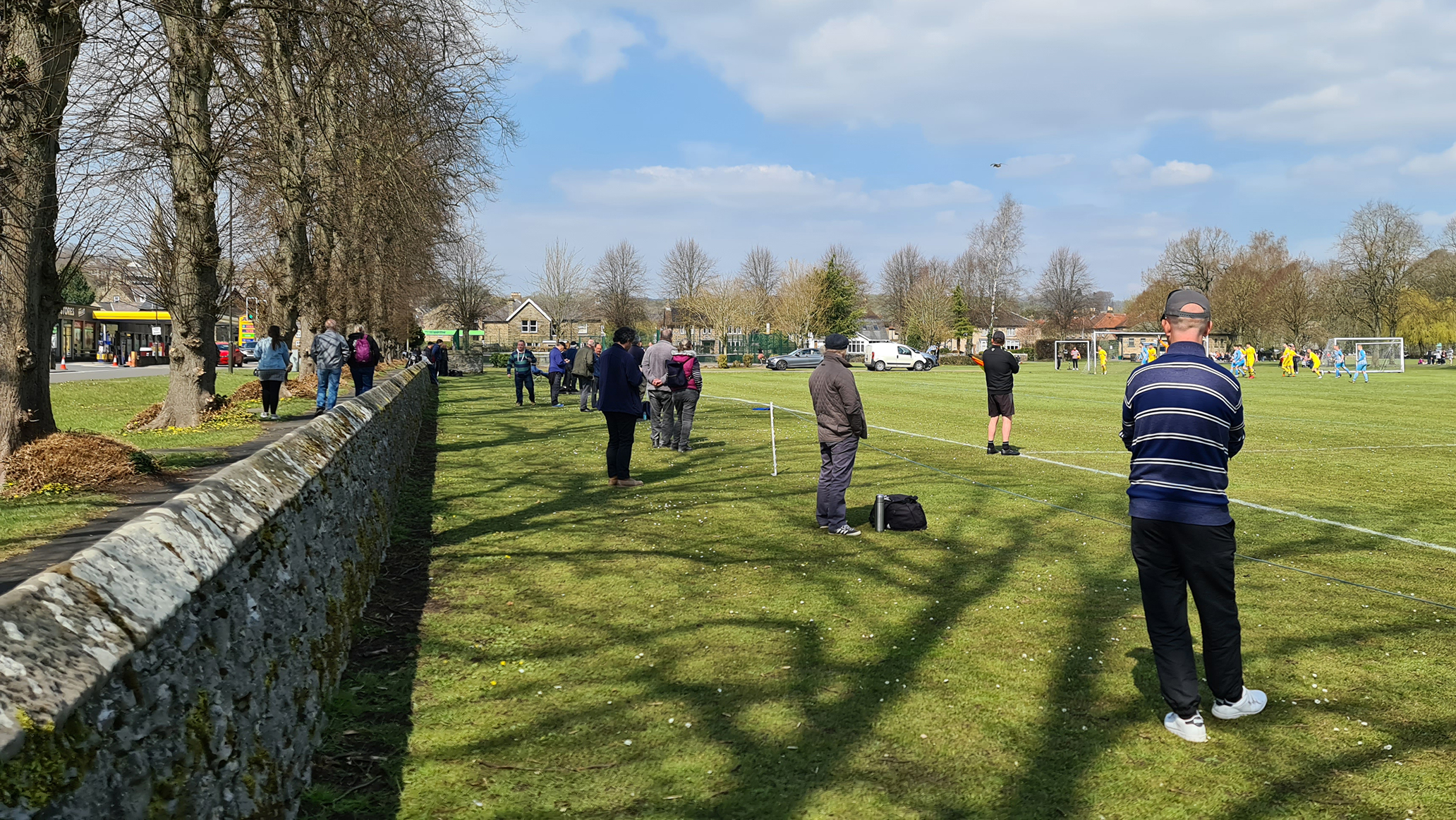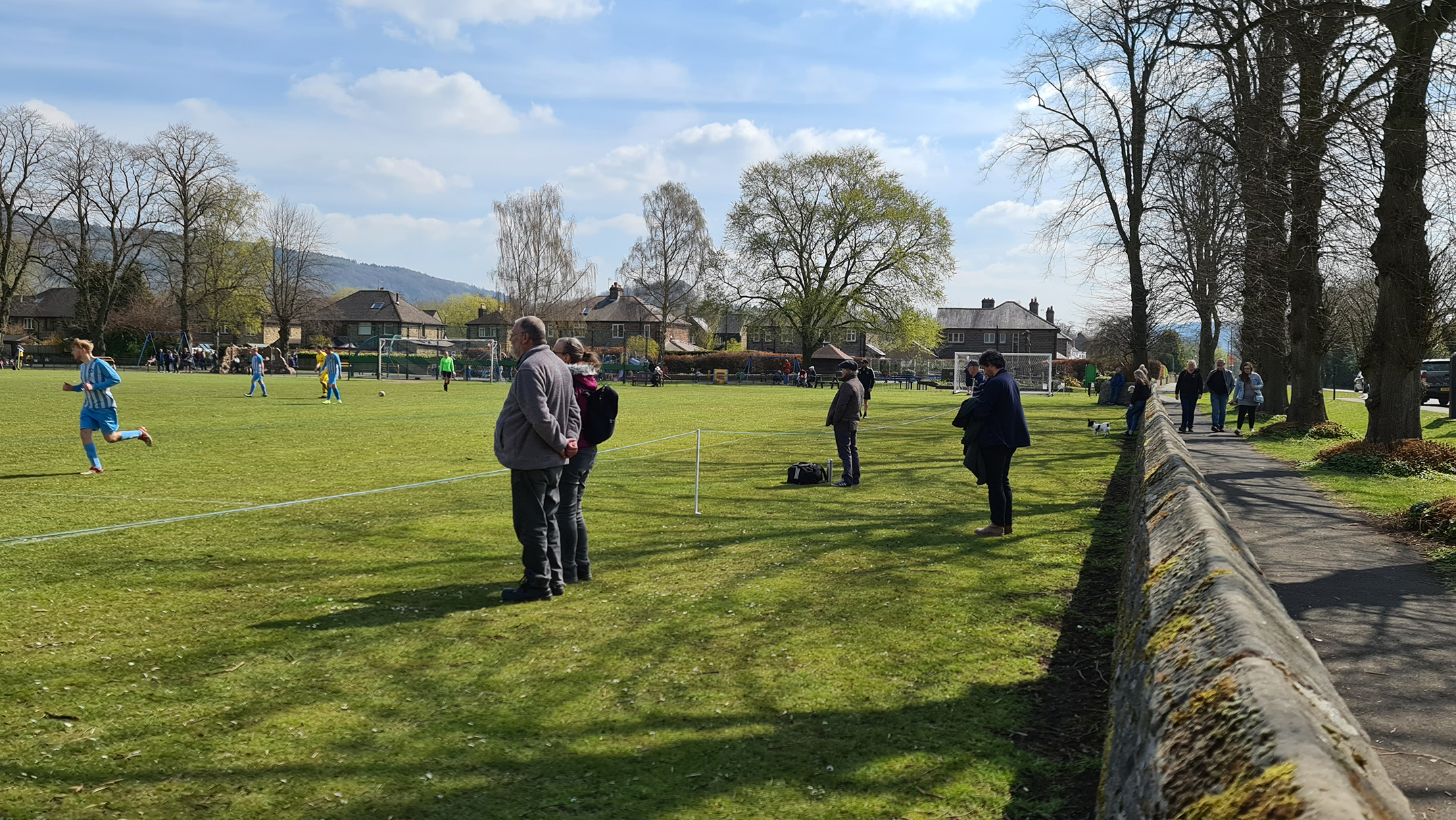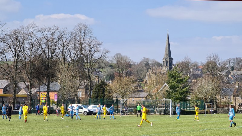 Zipping downhill into Chesterfield, we passed its famous crooked spire and continued clawing minutes back, arriving in Bakewell with just five minutes of the match gone. A sizeable crowd had gathered at the Recreation Ground, with both the cricket club and football club in action this afternoon. Spectators could watch both sports by strategically straddling the pathway which sliced directly through the middle. The football club, on this occasion, were playing on the pitch closest to the A6, with just a small dry stone wall preventing a misplaced through ball from reaching the passing traffic.