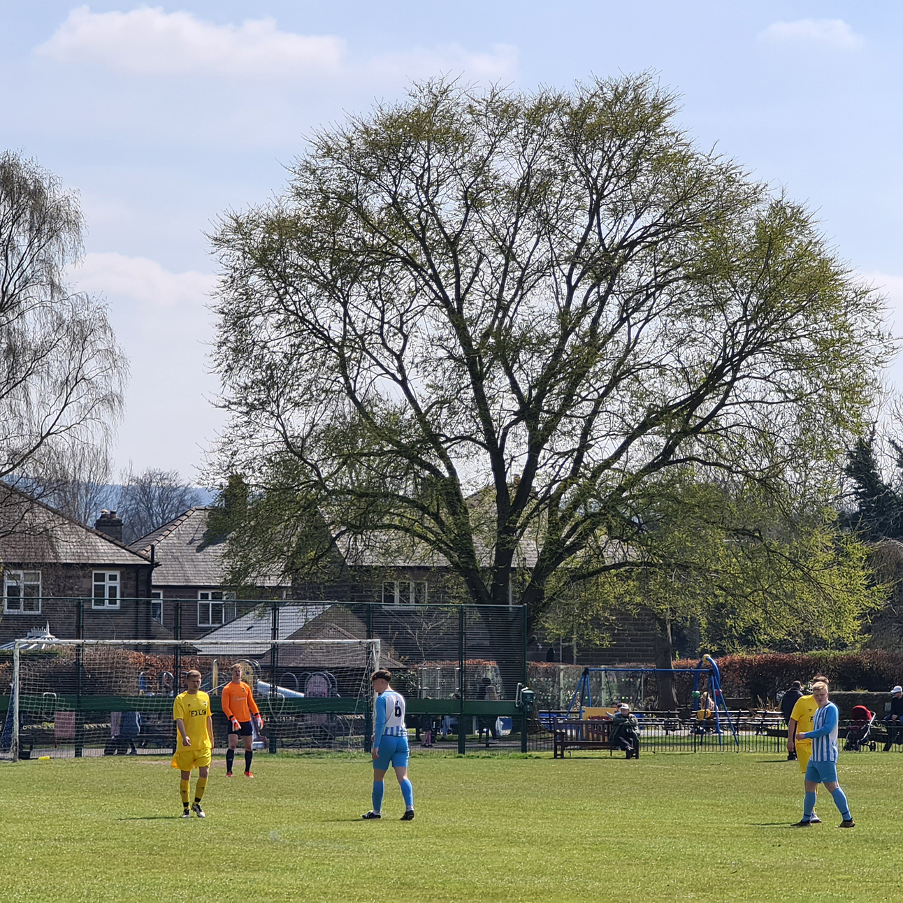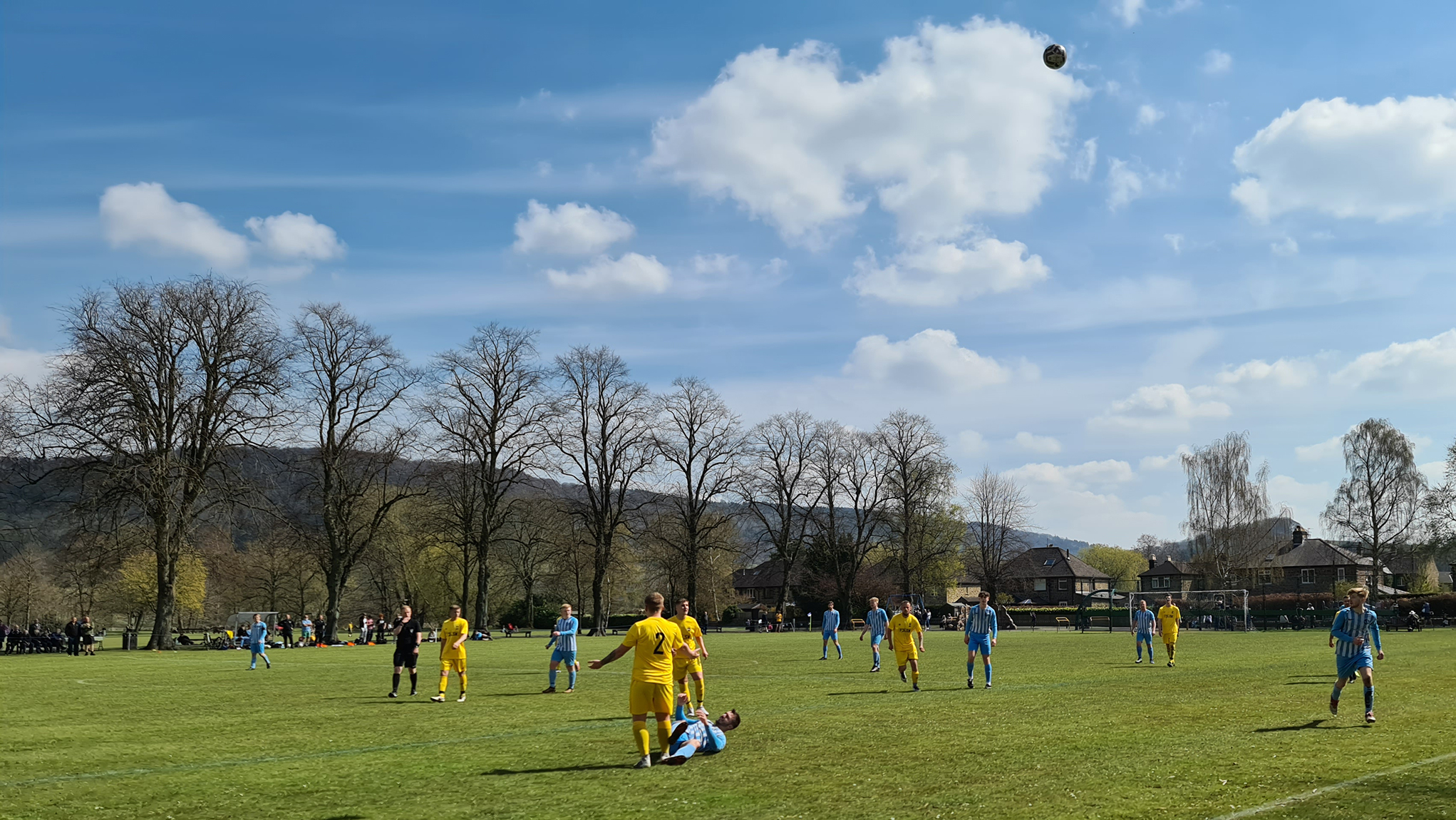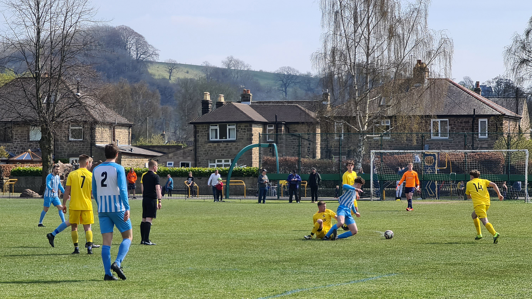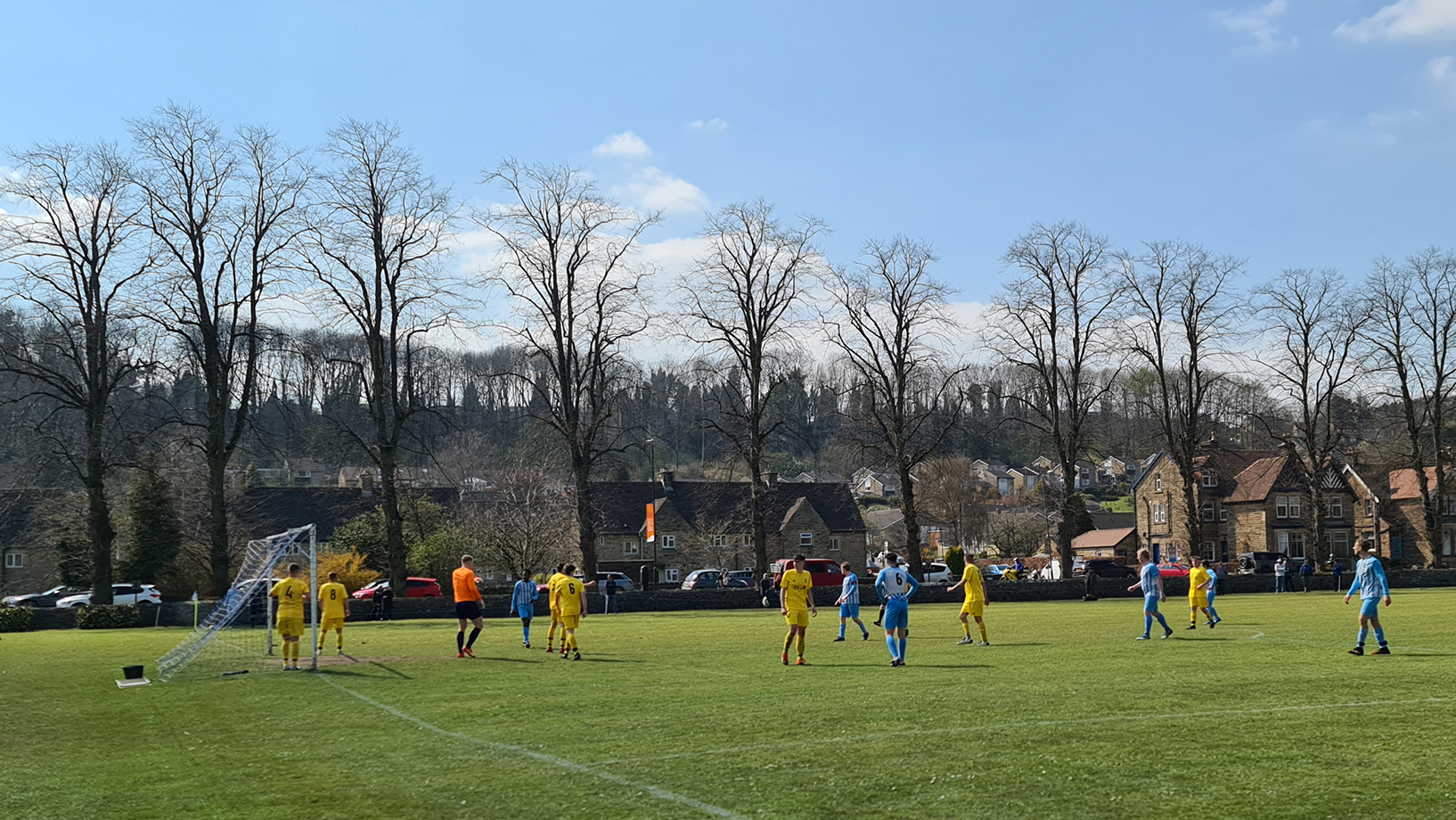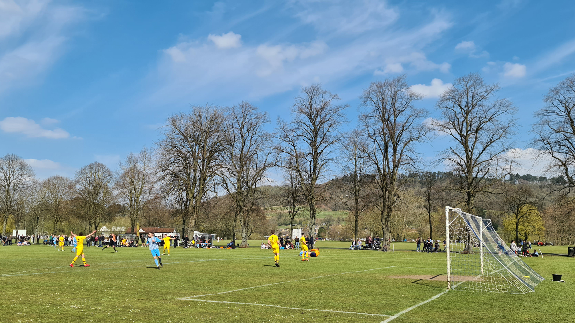 Zipping downhill into Chesterfield, we passed its famous crooked spire and continued clawing minutes back, arriving in Bakewell with just five minutes of the match gone. A sizeable crowd had gathered at the Recreation Ground, with both the cricket club and football club in action this afternoon. Spectators could watch both sports by strategically straddling the pathway which sliced directly through the middle. The football club, on this occasion, were playing on the pitch closest to the A6, with just a small dry stone wall preventing a misplaced through ball from reaching the passing traffic.