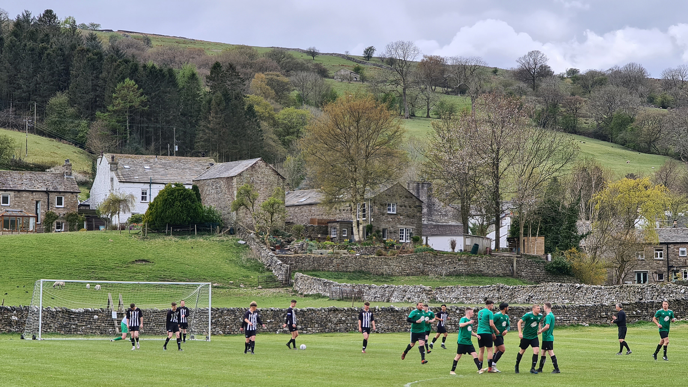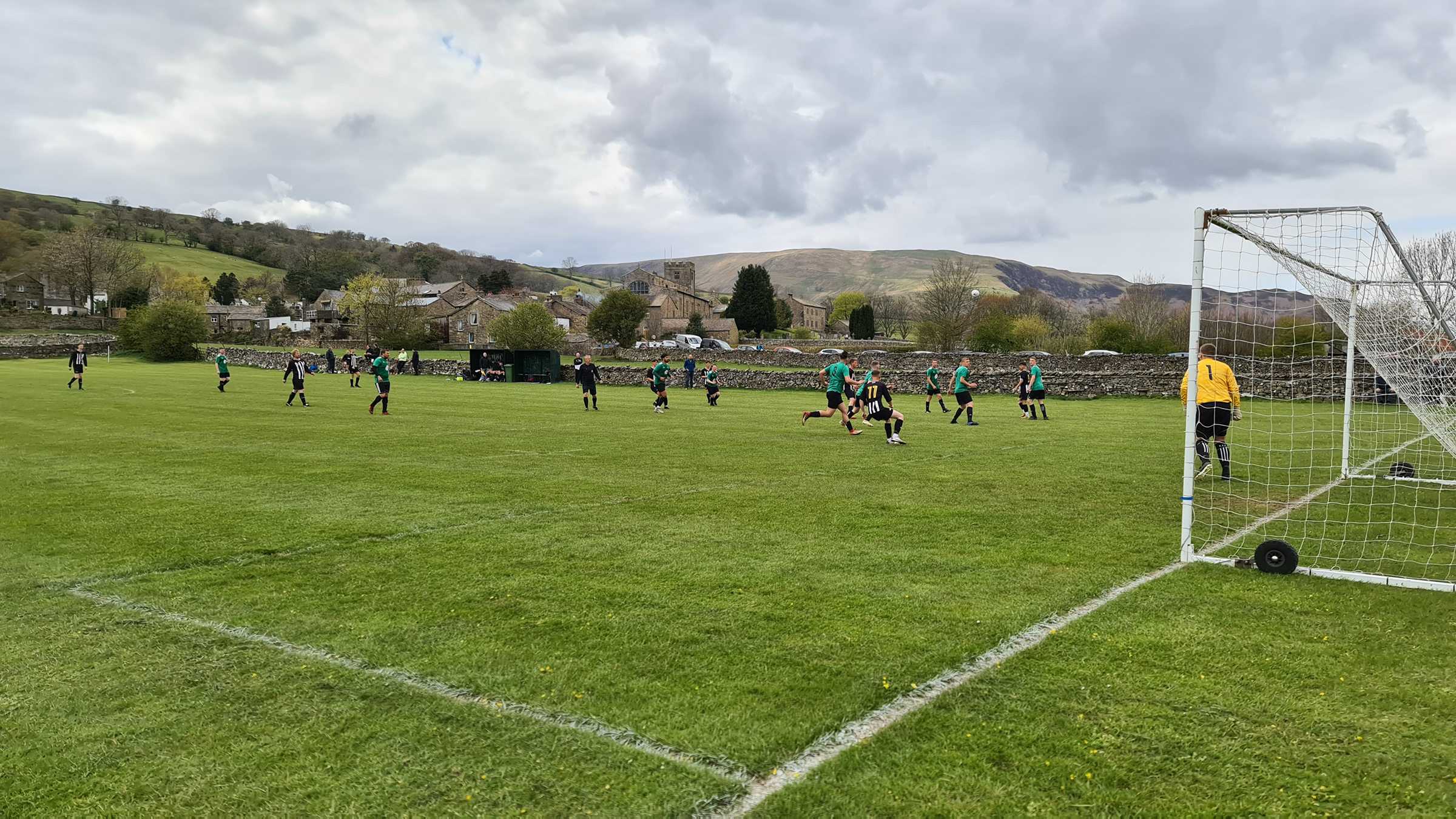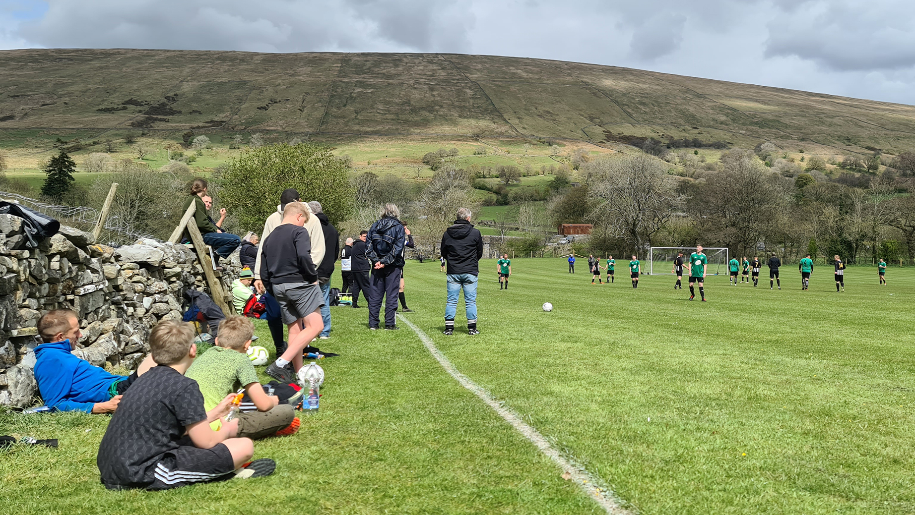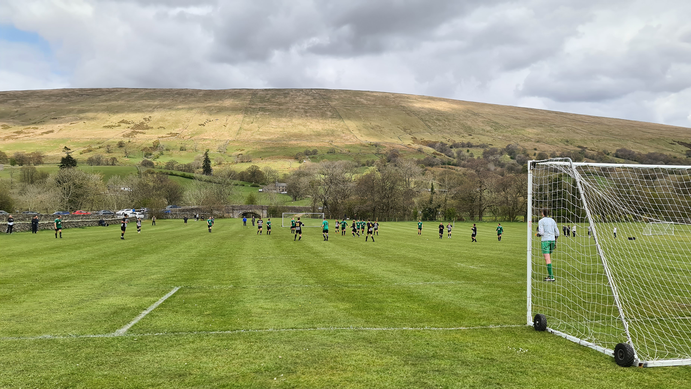 With the referee’s whistle drowned out by the sounds of newborn lambs, the game got underway. Sedbergh & Dent were in green shirts with black shorts and socks, while visitors Shap were in black and white stripes. I noticed immediately that the two blokes who had been roped into being linesmen were both sporting club tracksuits, which while not being unusual at this level, would have a huge impact on the game as I saw a level of corruptness tantamount to a Venezuelan presidential election.