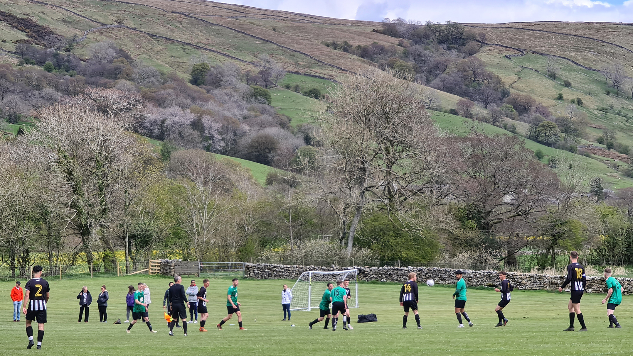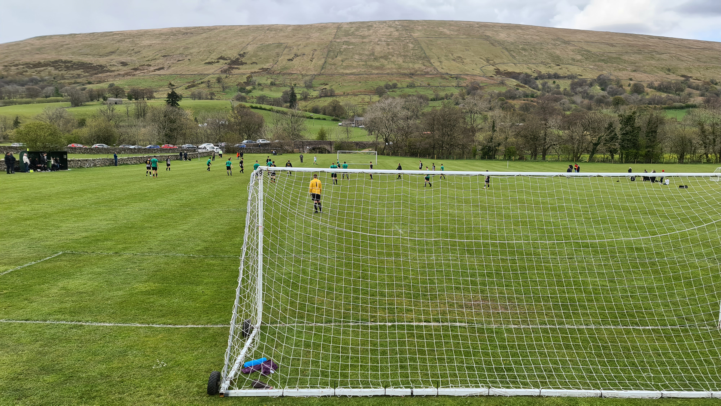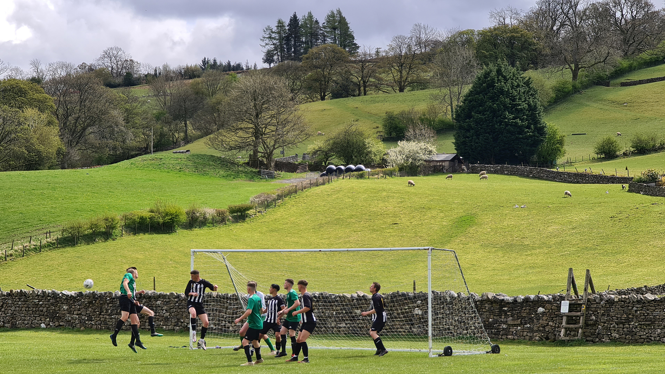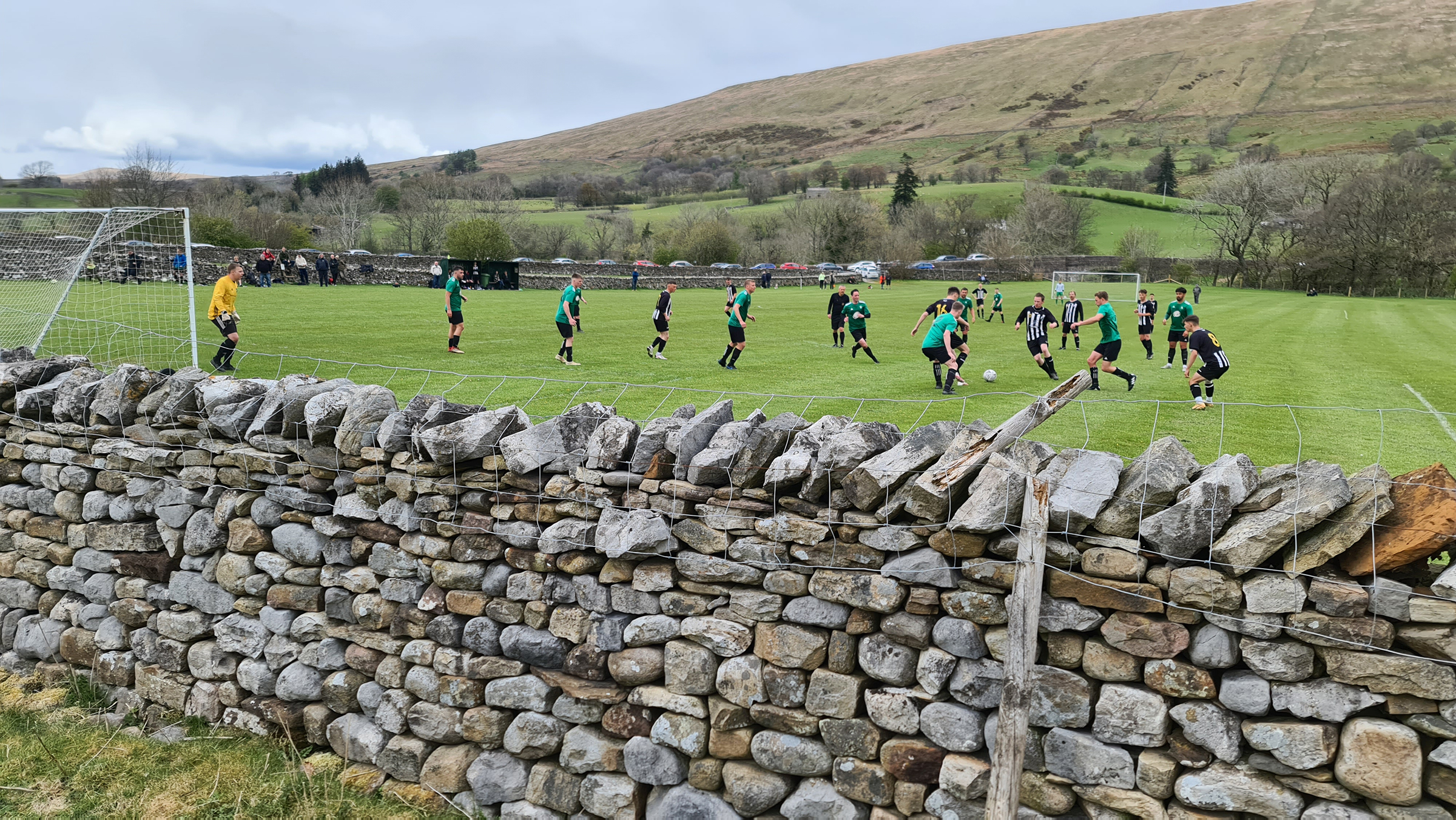 With the referee’s whistle drowned out by the sounds of newborn lambs, the game got underway. Sedbergh & Dent were in green shirts with black shorts and socks, while visitors Shap were in black and white stripes. I noticed immediately that the two blokes who had been roped into being linesmen were both sporting club tracksuits, which while not being unusual at this level, would have a huge impact on the game as I saw a level of corruptness tantamount to a Venezuelan presidential election.