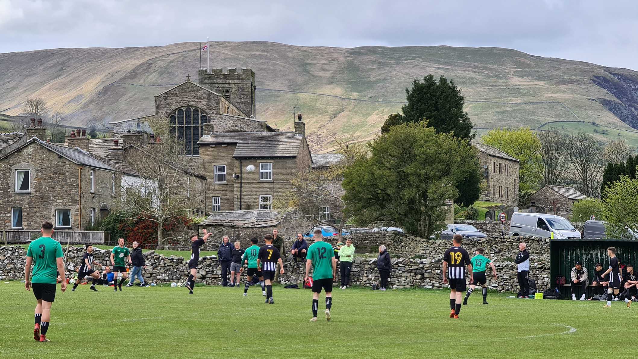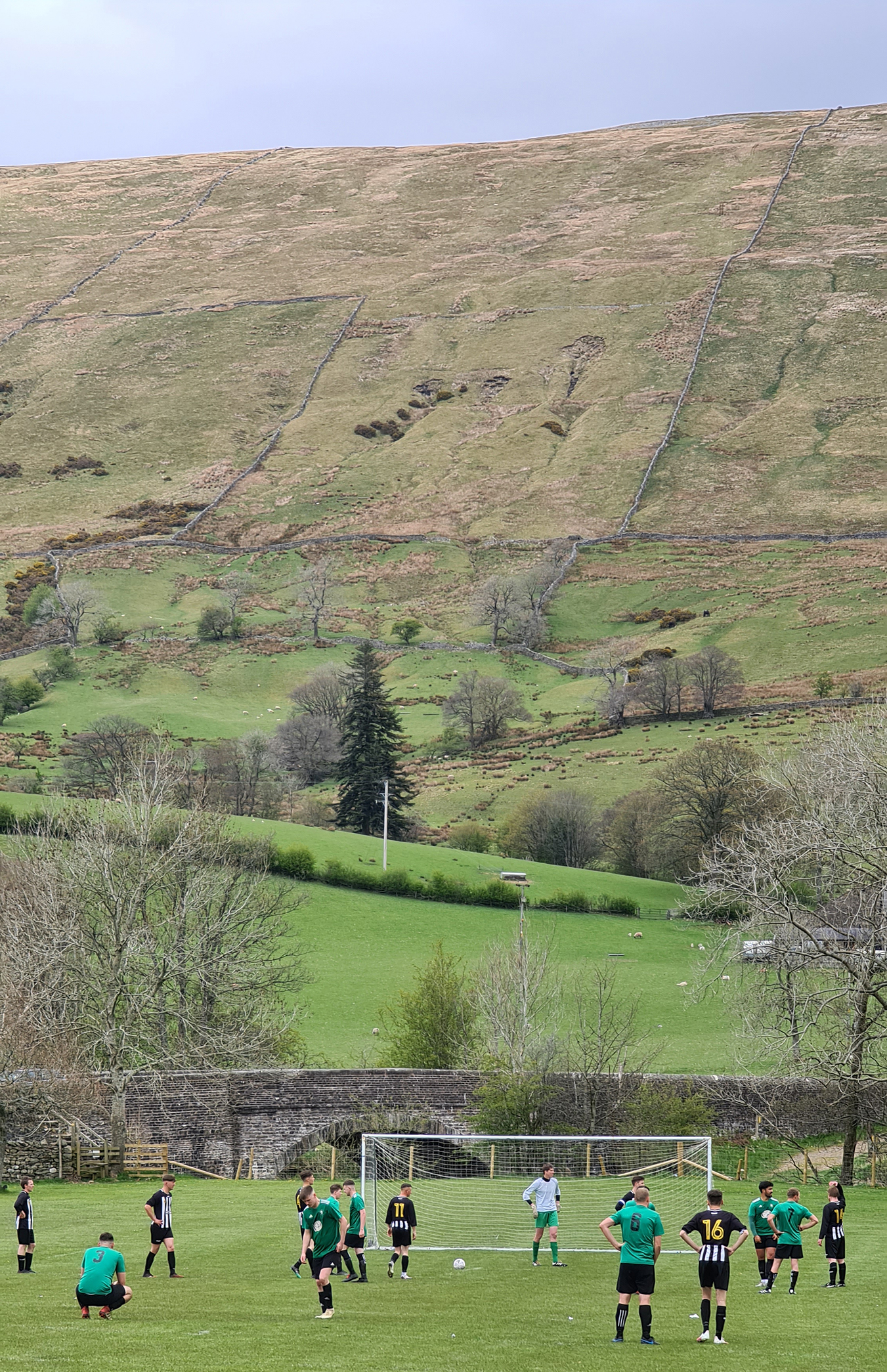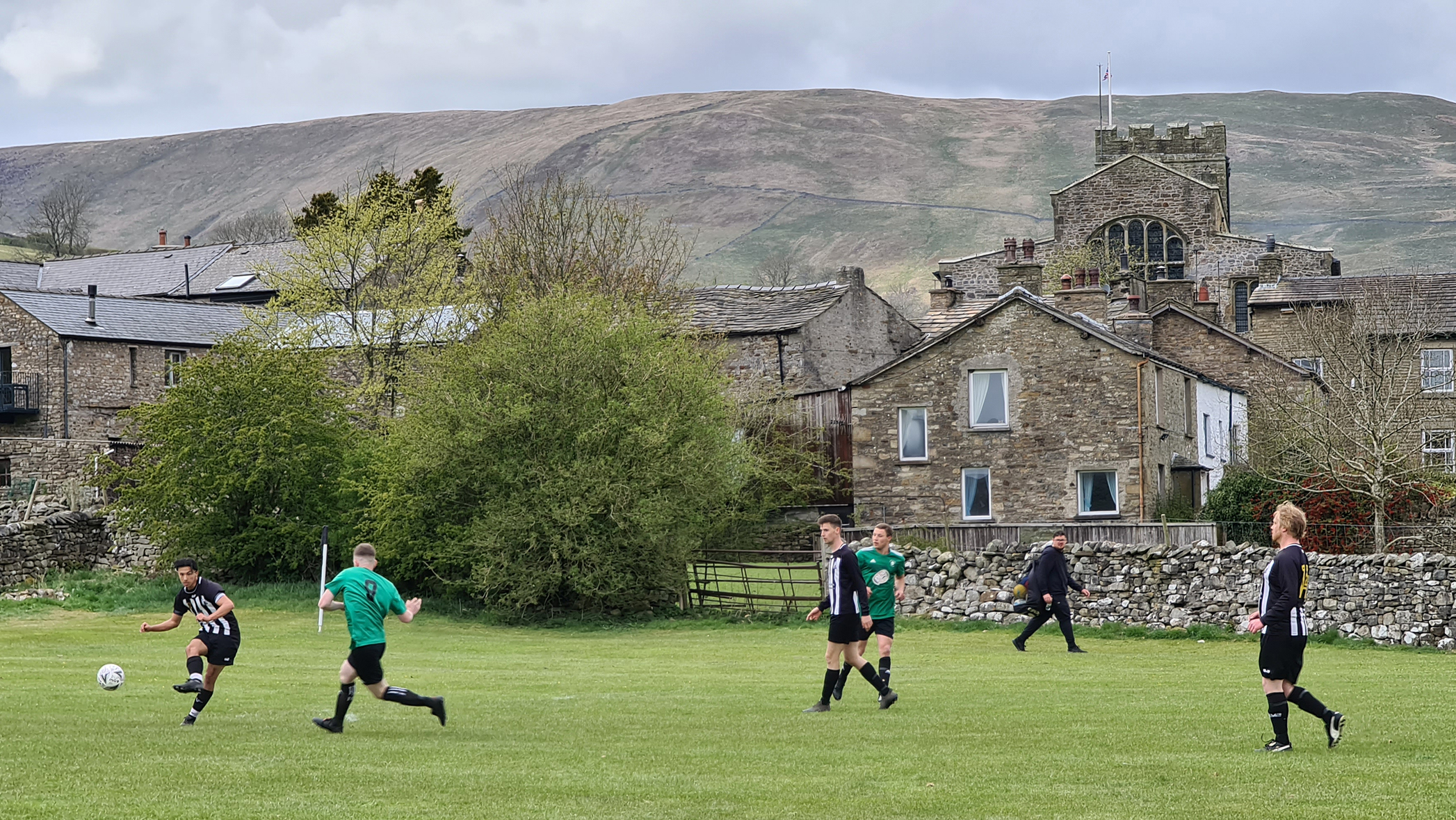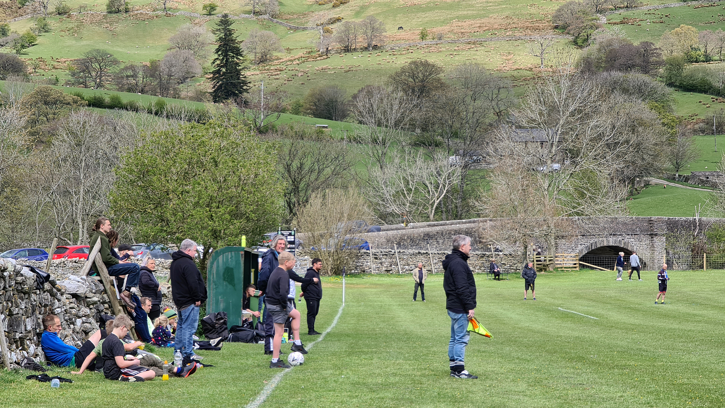 With the referee’s whistle drowned out by the sounds of newborn lambs, the game got underway. Sedbergh & Dent were in green shirts with black shorts and socks, while visitors Shap were in black and white stripes. I noticed immediately that the two blokes who had been roped into being linesmen were both sporting club tracksuits, which while not being unusual at this level, would have a huge impact on the game as I saw a level of corruptness tantamount to a Venezuelan presidential election.